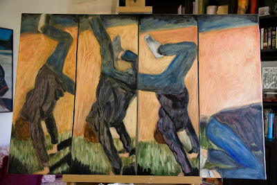 Day One – put a wash on the canvas and started sketching in all those damn limbs!