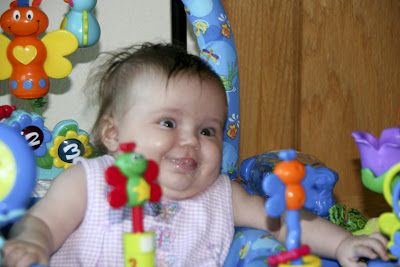 Yes, the rolling from back to front has been perfected. And that girl is fast. She’s over in the blink of an eye. In the beginning she would roll over onto her stomach and then quickly become frustrated at being on her stomach. So, we would put her back on her back. She would immediately roll onto her stomach again. And then be pissed off about it. Again. I’m pretty sure this would have gone on indefinitely if we hadn’t gotten tired and strapped her back into her bouncy chair.