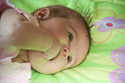 Wait until she manages to get a foot to her mouth –oh the unbridled toe chewing joy. I’m sure that’s what she’s thinking when we catch her staring intently at one of those chubby little piggys. “Mmm foot…must taste.” What I don’t know is how she’ll squeeze a foot into her mouth when she’s already got her whole fist shoved in there! And I’ve caught her on several occasions sneaking a thumb in there right next to the nipple when I’m giving her a bottle. And hey baby – it’s a little difficult to feed you when you’re trying to roll over on my lap! Eyes forward soldier. Jeez.